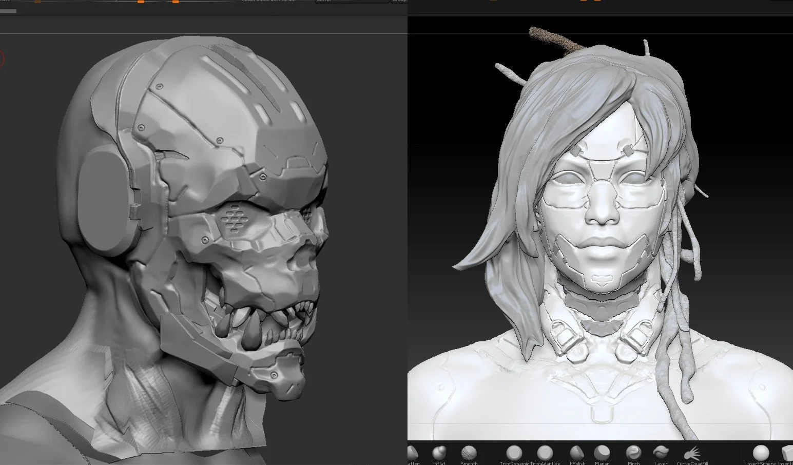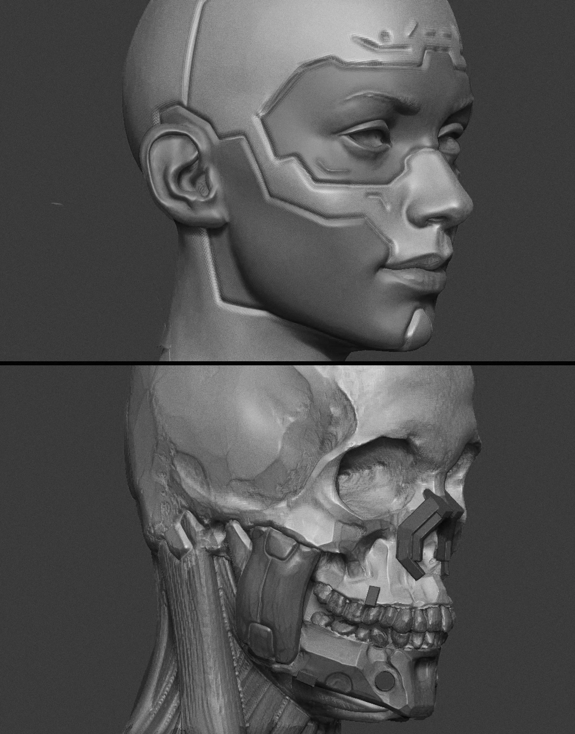 Many of my character concept art pieces include assets that I've rarely showcased individually. With my sci-fi character designs, most of them feature a robotic implant of some sort. Arms like these start from a free base mesh; like a normal human arm;which I then sculpt on top of by re-skinning it as hard-surface and converting all the human joints, fingers, and bending parts into screws, pistons, and ball joints. Essentially, I reimagine the human body as a machine.