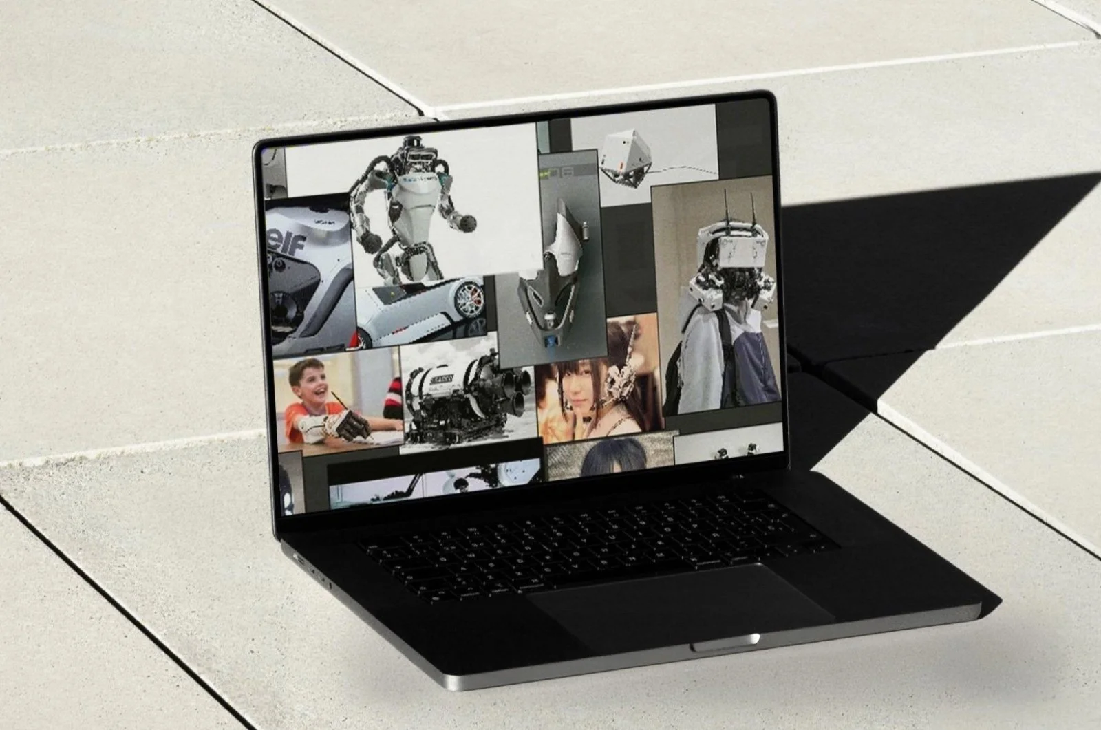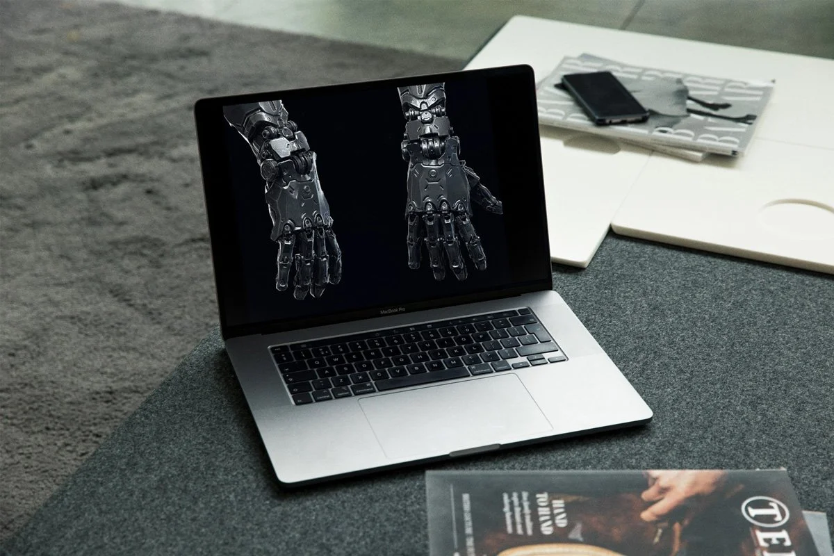 Laptop displaying robotic hand renders – concept artist portfolio with sci-fi limb designs and 3D models