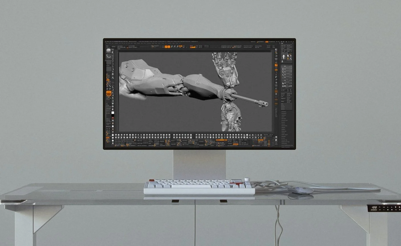 Cybernetic arm 3D model render – advanced mechanical hand in sculpting software with fine detailing on laptop