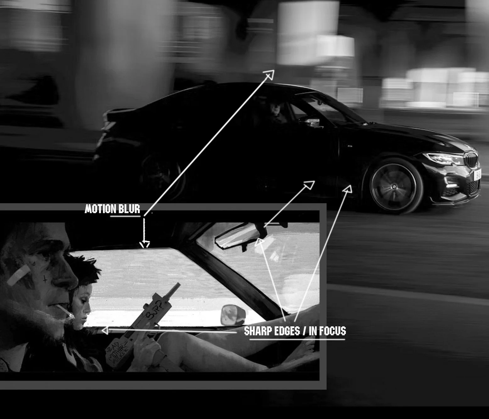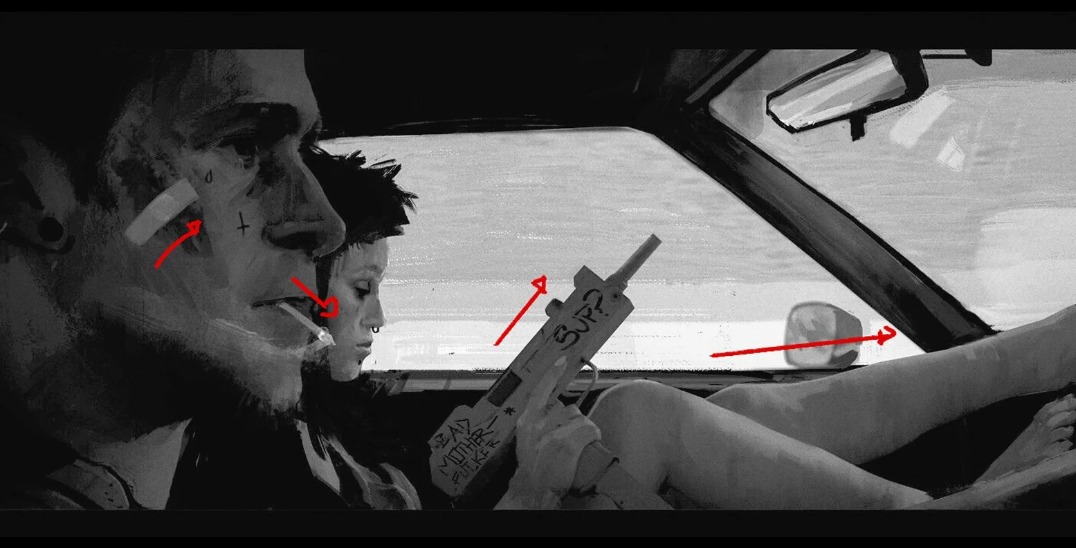 Another way to make concept art efficient is by suggesting details instead of over-rendering. In this car chase, I used directional brushstrokes to mimic motion blur and shadows to make the detail distribution better.